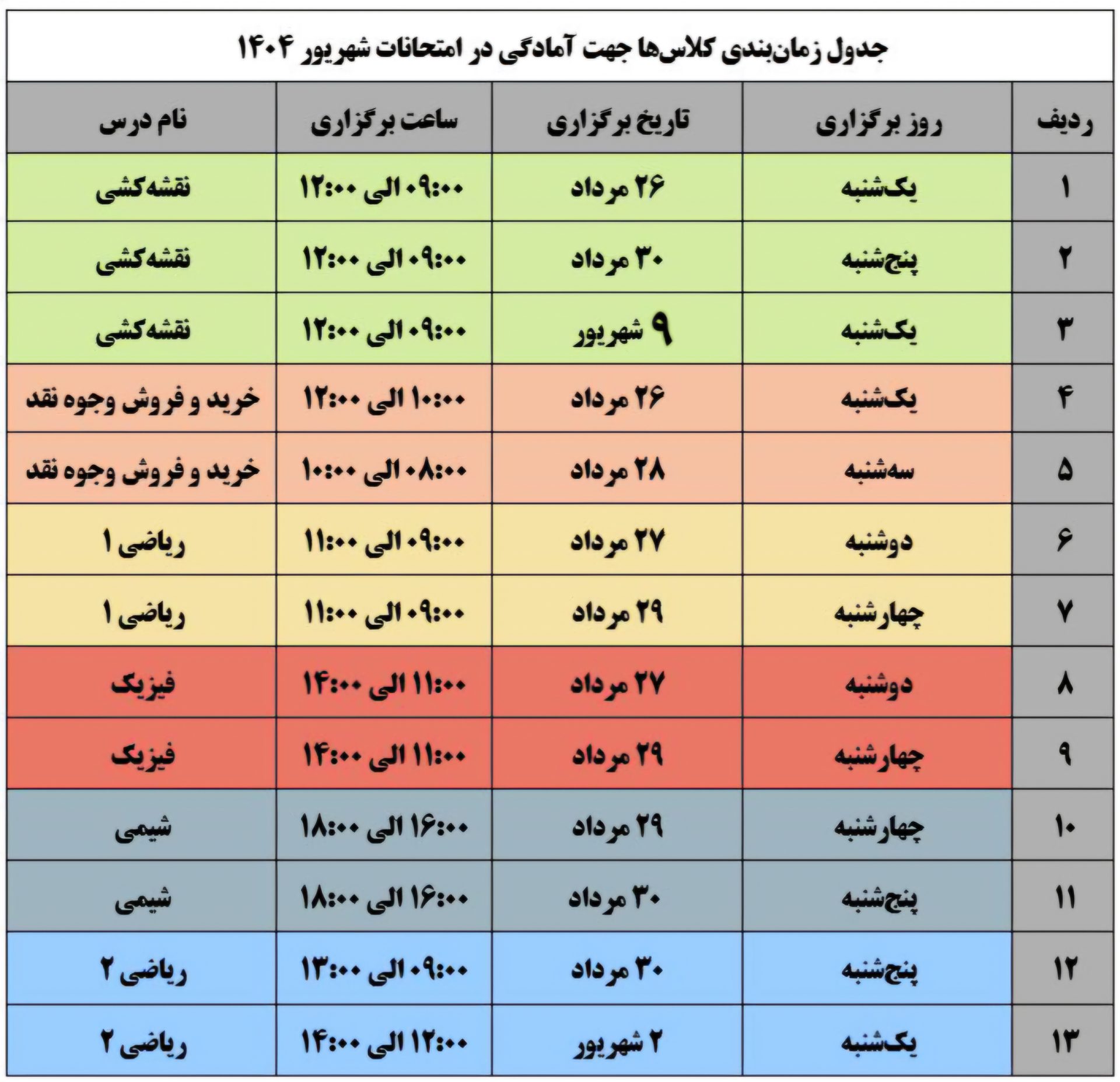 کلاسهای تقویتی جهت آمادگی در امتحانات شهریورماه 1404 طبق